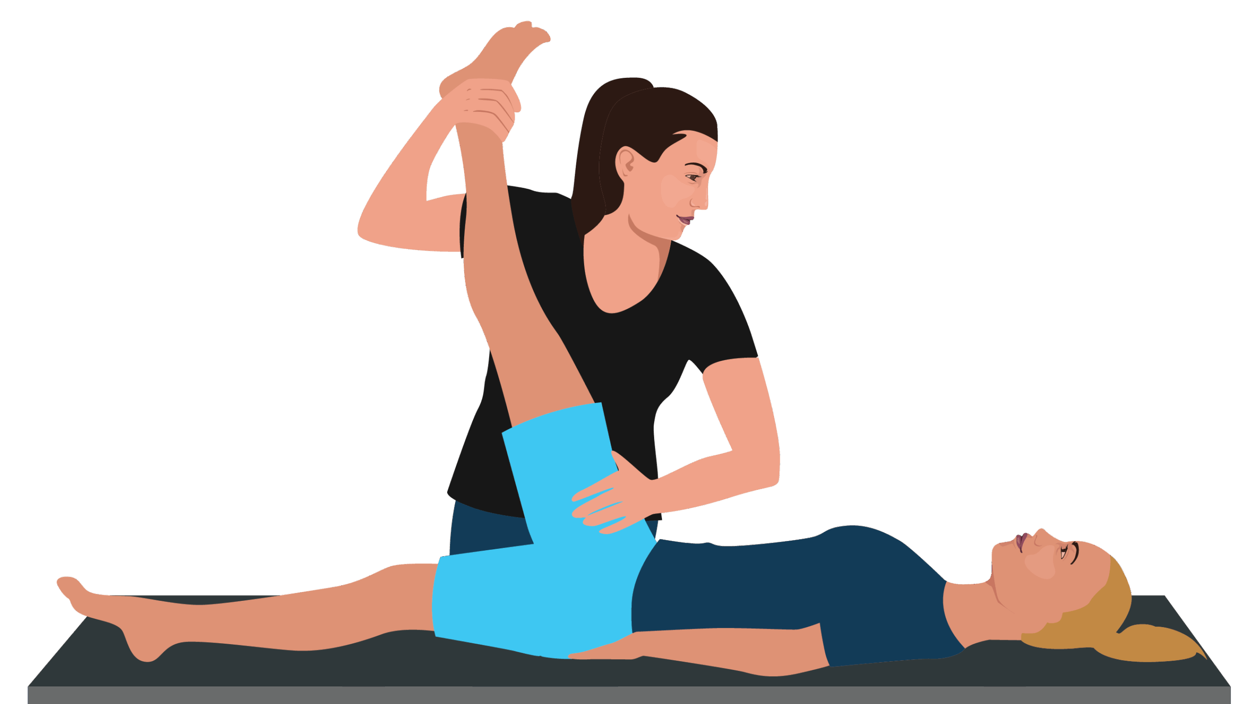 The therapist passively lifts one straightened leg upward (hip flexion), keeping the knee fully extended.