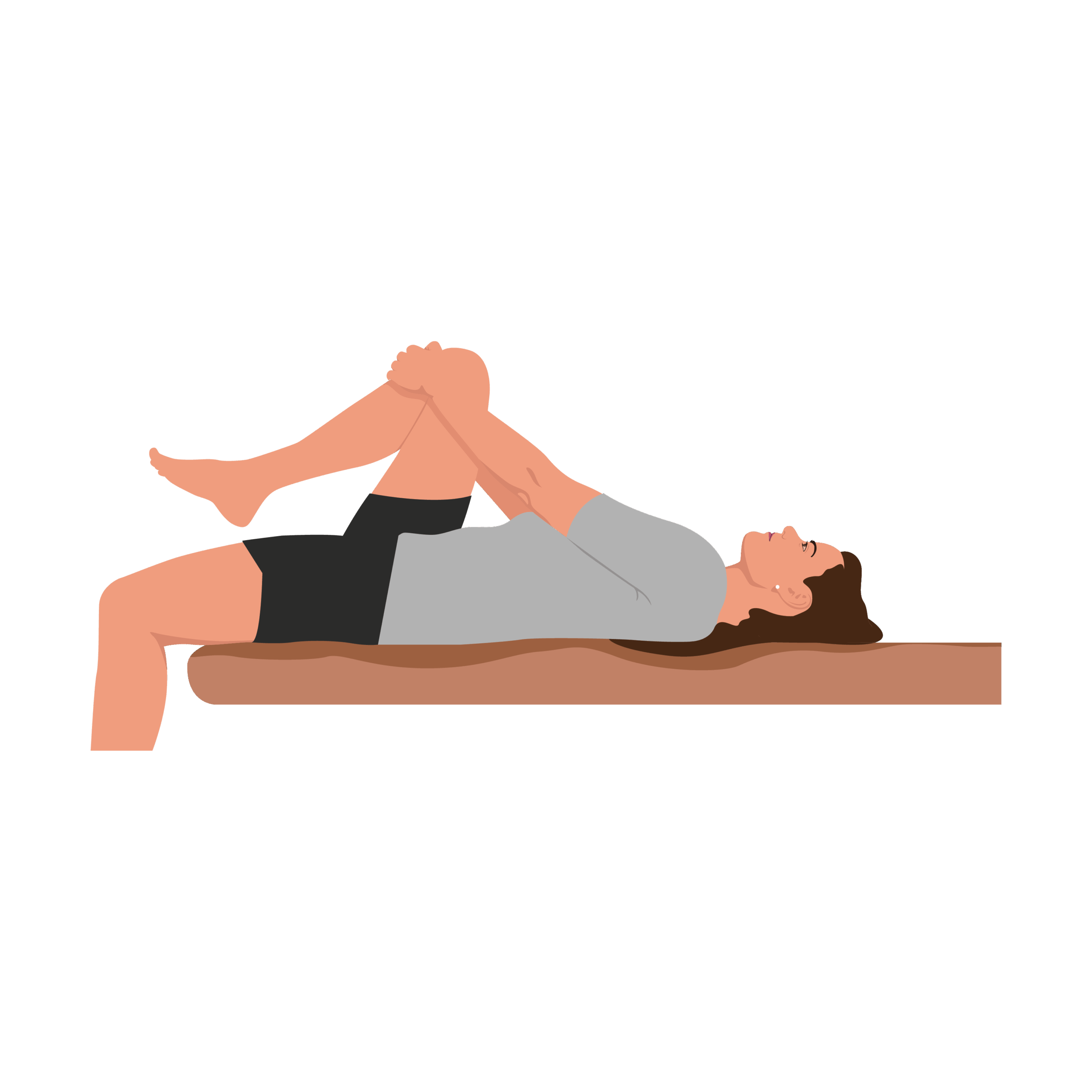 The client flexes one hip (brings knee toward the chest) and holds it with both hands, flattening the lumbar spine and pelvis against the table.